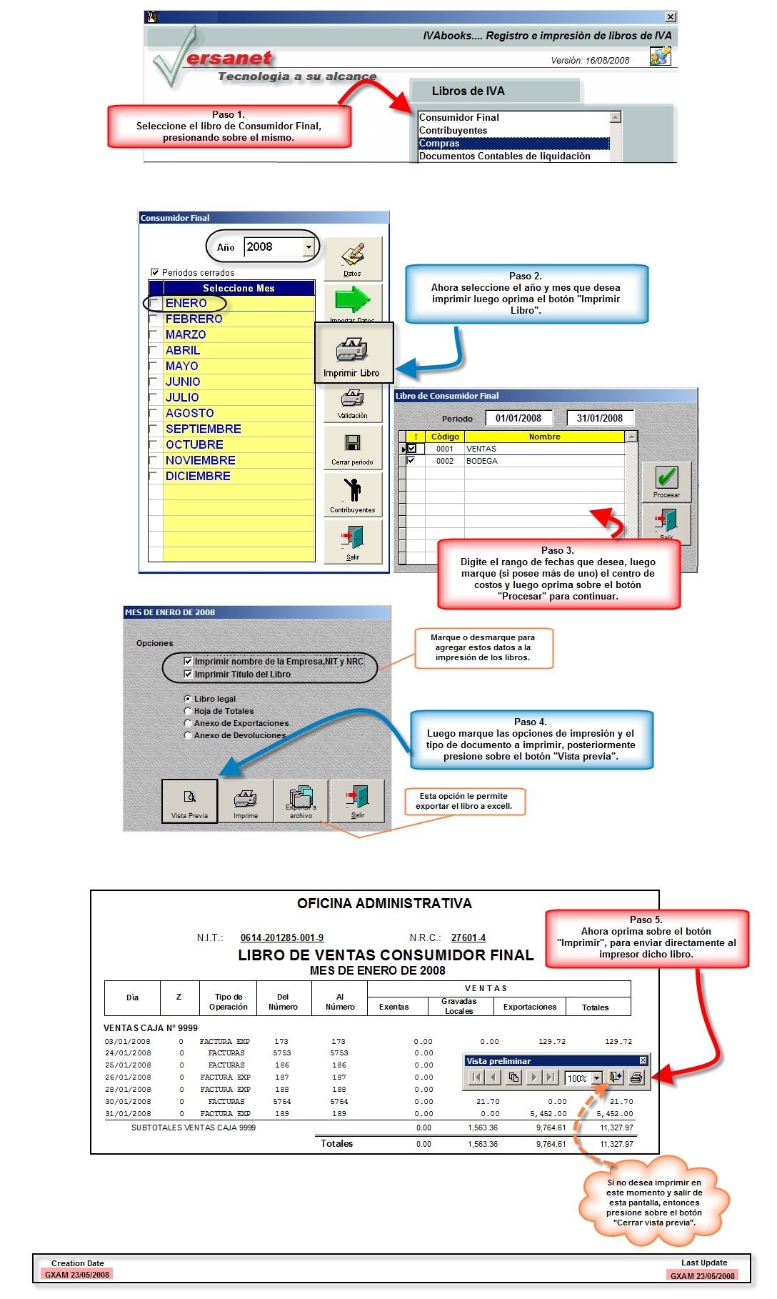 La opción Imprimir libro, le permite imprimir los libros legales de IVA de la empresa, además de una vista previa y también enviar los datos a un archivo a excell.