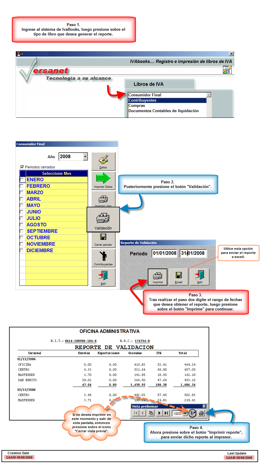 La opción de VALIDACIÓN, le permite imprimir un reporte de las ventas mensuales, sucursal por sucursal, y al final valoriza la venta total del mes. También puede obtener un reporte por las compras.