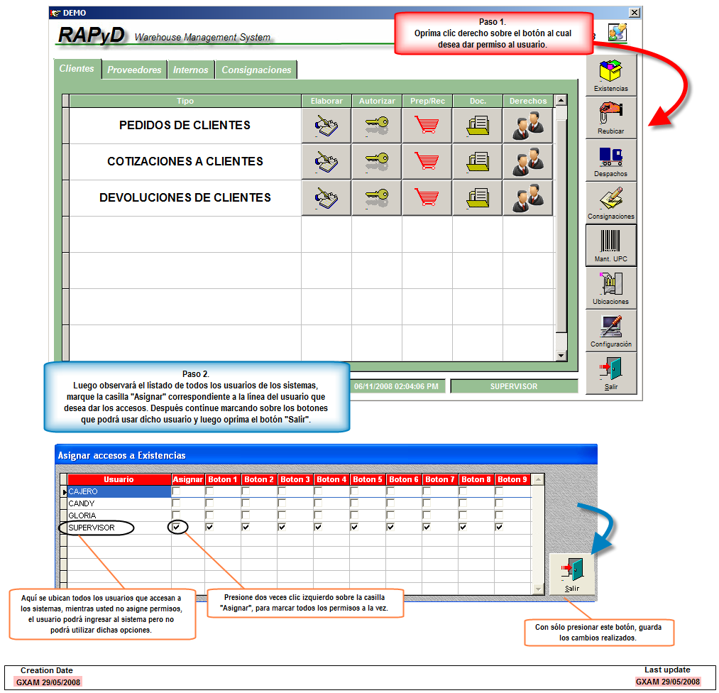 Como se mencionó anteriormente el sistema cuenta con dos niveles de seguridad para asignar permisos a los usuarios, el primero es sólo para el menú y el siguiente es para utilizar las opciones como:
