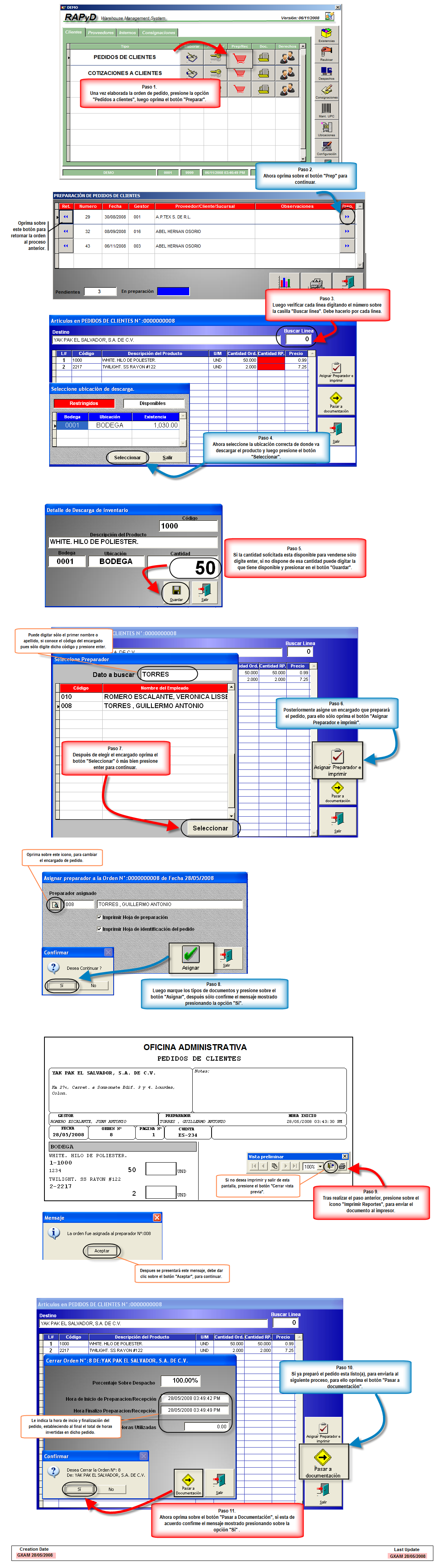 También aquí obtiene la impresión del listado de productos con la que cuenta la orden y asignarla a una persona encargada para que prepare la mercadería. Desde el momento en que imprime dicho listado se activa un marcador para evaluar el rendimiento de despacho y horas de preparación que invirtio tal persona.