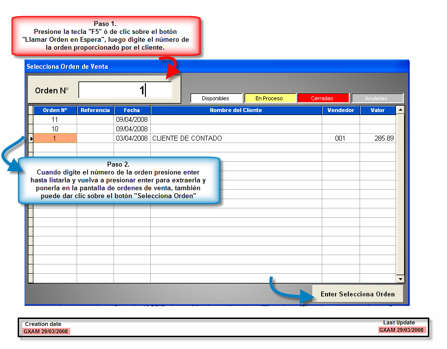 La recuperación de dichas ordenes consiste en extraerlas ya sea para modificarlas (como agregar más productos, asignar descuentos o cambiar cantidades) ó convertirlas a un documento de venta, para ello sólo debe presionar la tecla "F5", recuerde que necesitará saber cuál es el número de dicha orden o el nombre con la que se guardó.