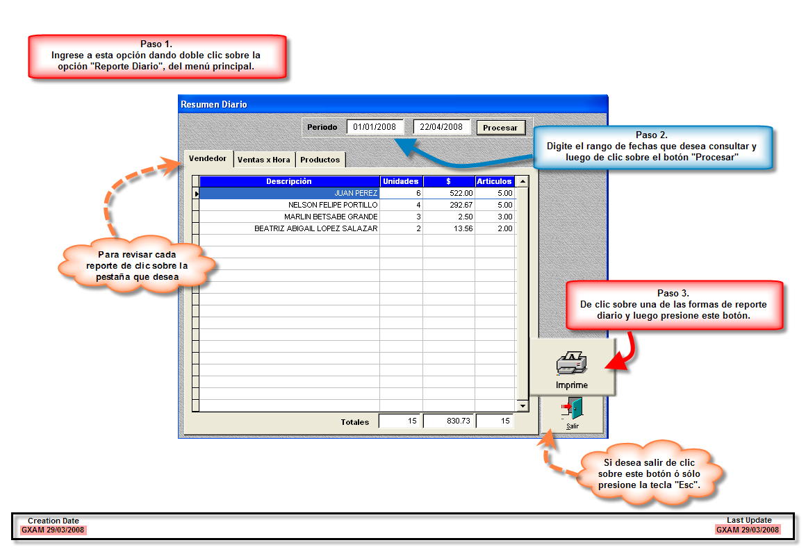 Además controla las ventas por cada vendedor, las ventas que se han realizado por hora, así como los productos que se han vendido durante ese día o en un rango determinado de fechas, esto le permite tener un reporte confiable de los productos que se están vendiendo diariamente y la frecuencia con que se están facturando todo para alertarle sobre la demanda y la compra de los mismos.