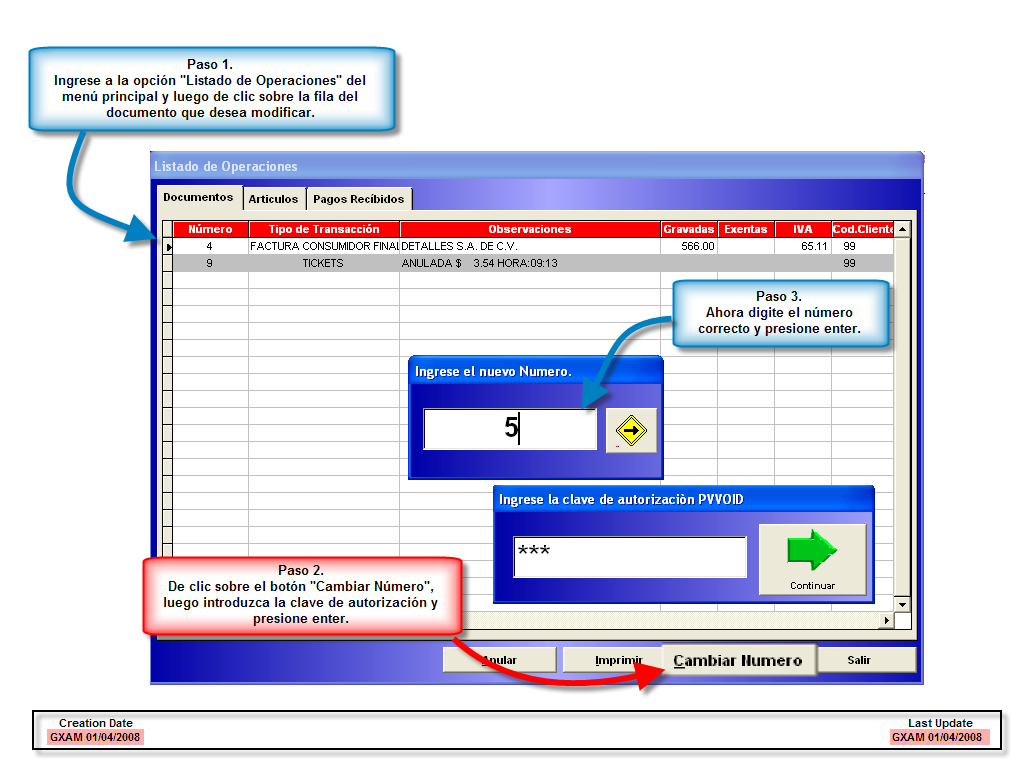 Esta opción le sirve para modificar números correlativos de documentos previamente impresos.