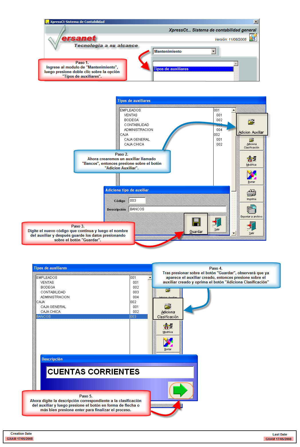 Bajo el sistema se trabaja por medio de agrupaciones, definiendo primero el tipo de auxiliar y luego adicionando a cada tipo la respectiva clasificación, por ejemplo si crea el tipo de auxiliar: Empleados, las clasificaciones serían empleados de: ventas, bodega, contabilidad, administración, entre otros; permitiéndole definirlos de manera detallada para llevar un control por cada una de ellas.