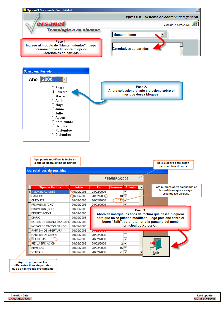 Desde la opción de Correlativos de partidas, se controlan las partidas que se aplicarán en un determinado mes, es decir que permite o bloquea que un determinado mes/año sea modificado.