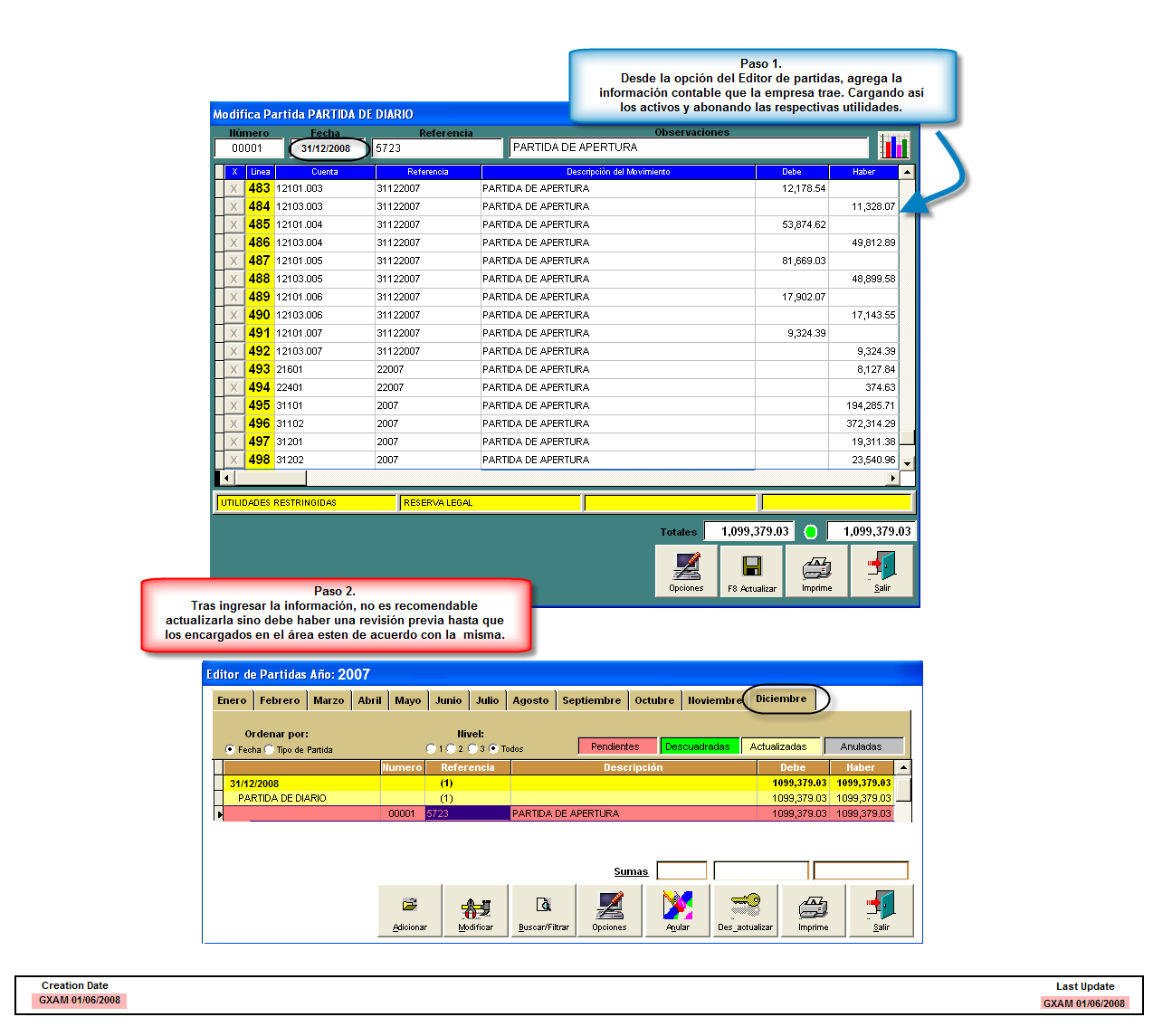 La partida de apertura se carga con la fecha del último día del mes anterior al que comenzara a trabajar, por ejemplo si la empresa en la que labora adquiere el sistema en enero de 2008, indica que la partida se registrará al 31 de diciembre del 2007. Esto es con el fin de establecer los valores iniciales que trae la empresa y no mezclarlos con la nueva información que ingresará al sistema.