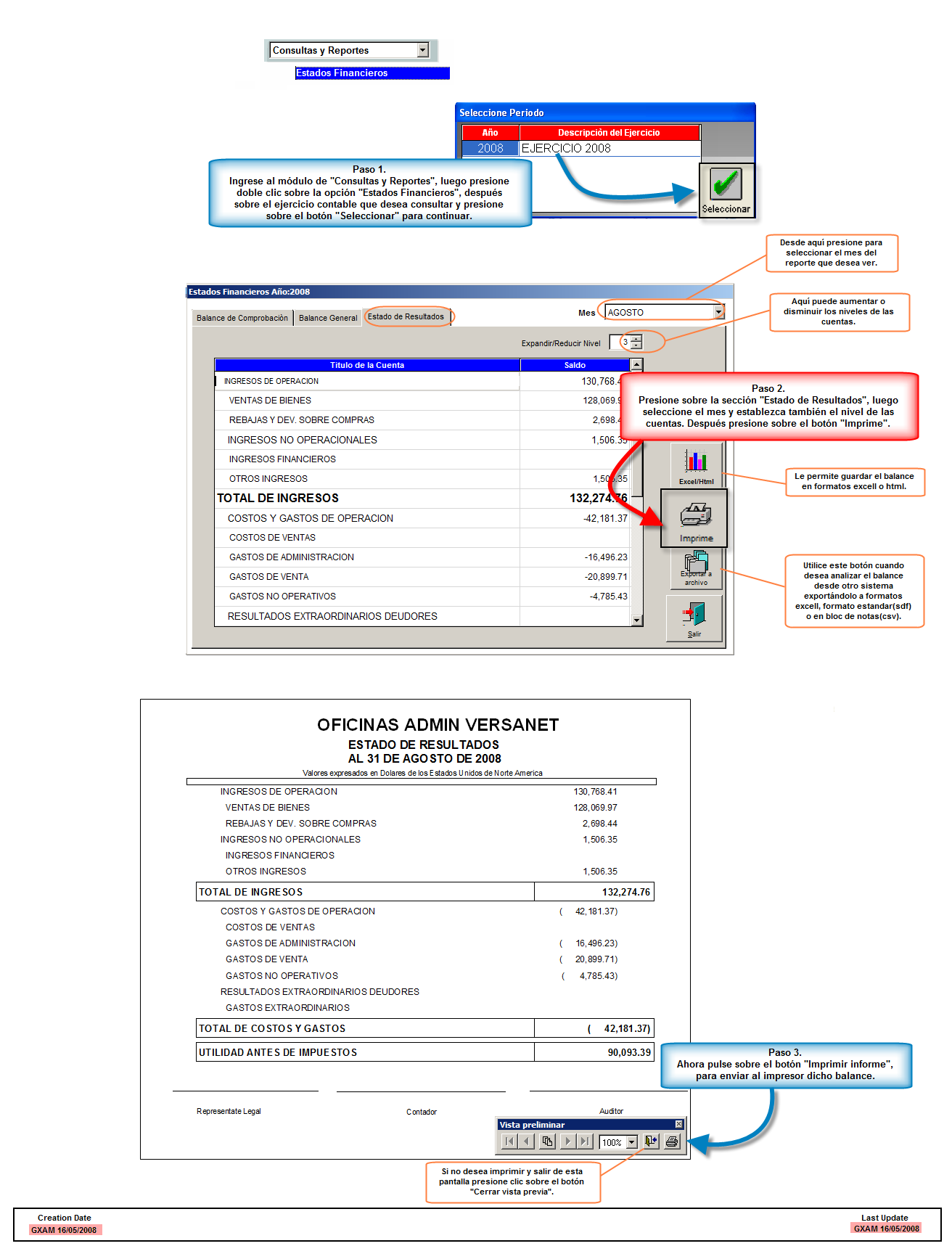 Bajo el sistema de Contabilidad se configura de forma tal que usted sólo deberá elegir el mes y nivel en que desea dicho estado luego dispone de las opciones imprimir y enviar a archivo.- El sistema no sólo ofrece una forma de obtenerlo sino también lo puede realizar desde el módulo CONSULTAS Y REPORTES/ESTADOS DE RESULTADOS.
