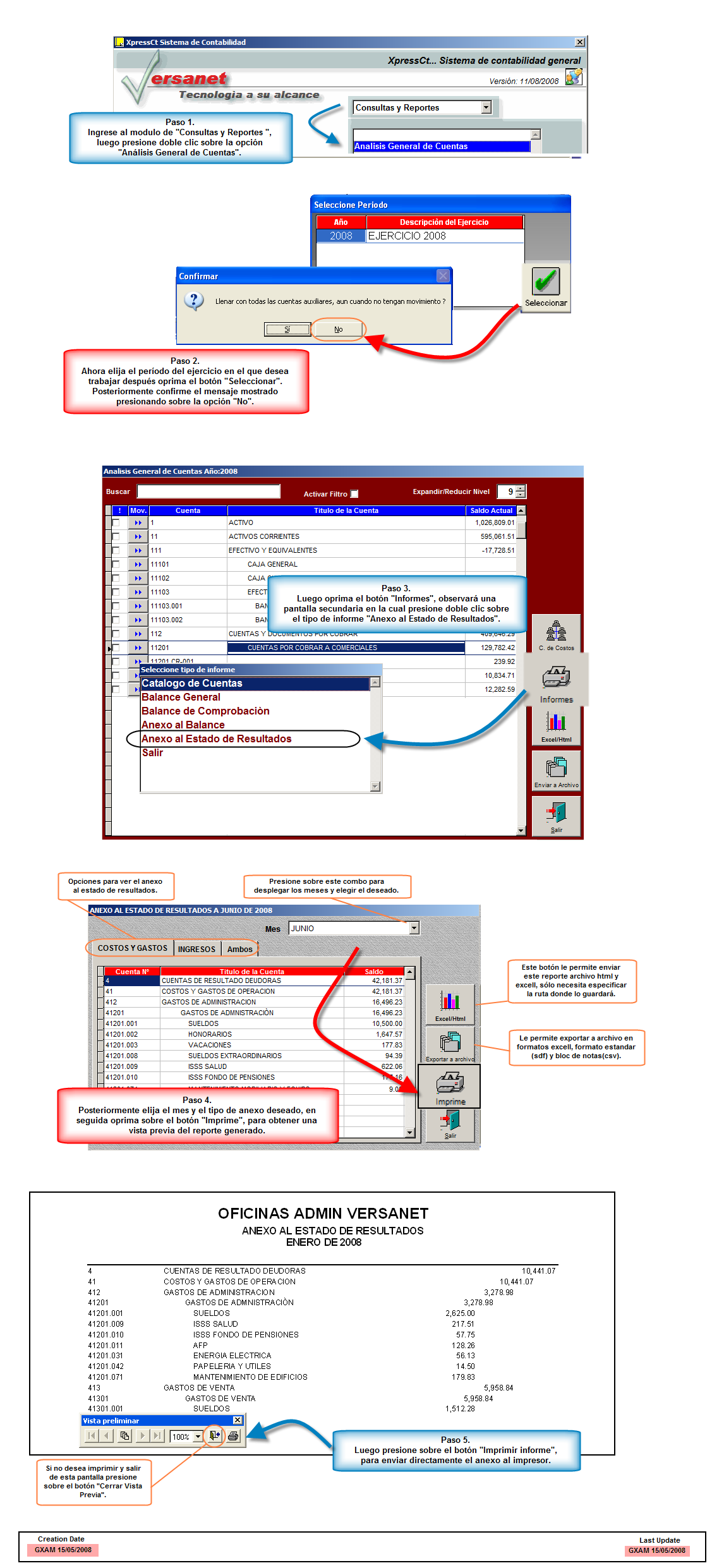 El anexo al estado de resultado es otro de de los informes que ofrece el sistema de contabilidad, dicho informe le presenta los saldos del mes por COSTOS Y GASTOS e INGRESOS y detallado por cuentas de mayor y cuentas auxiliares.