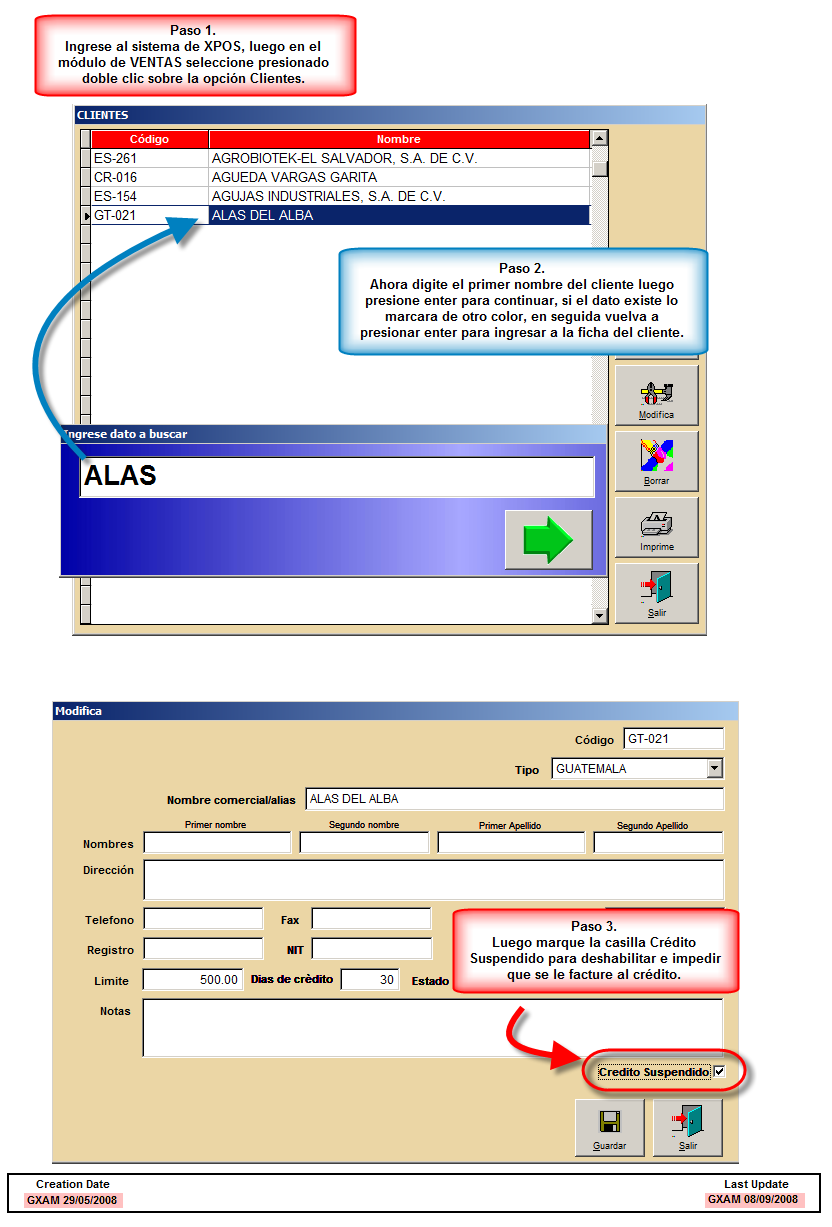 Recuerde que para conceder crédito nuevamente tendrá que desactivar la casilla "CREDITO SUSPENDIDO".
