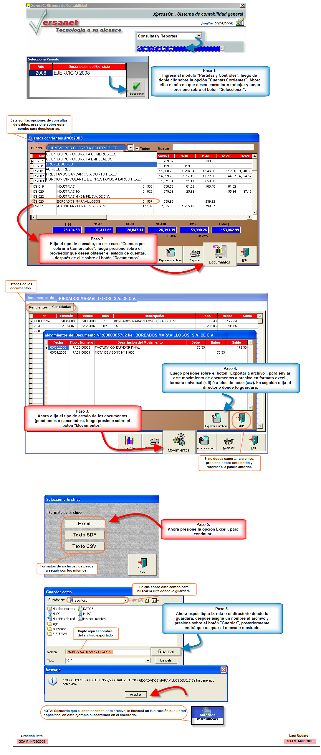 Este archivo se alimenta en base a los movimientos afectados en determinada cuenta auxiliar, iniciando con la revisión de los documentos, luego consultando los movimientos que se han efectuado, así el sistema ofrece la opción de exportación de datos a archivos excell, formato universal (sdf) o bloc de notas (csv).